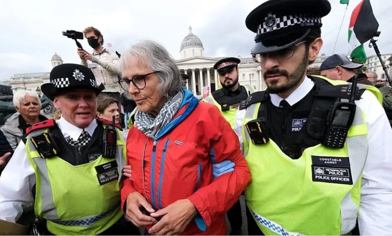 وألقت الشرطة القبض على المحتجين في ساحة الطرف الأغر بوسط لندن بعد رفعهم لافتات حملت شعارات مؤيدة لحركة “فلسطين أكشن” التي جرى حظرها في تموز/ يوليو بعد أن اقتحم أعضاؤها قاعدة جوية وألحقوا أضرارا بطائرات عسكرية.